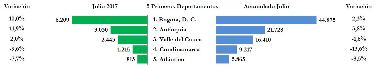 Después de Bogotá, D. C., los siguientes los departamentos en la lista con mayor número unidades nuevas fueron Antioquia, Valle del Cauca, Cundinamarca y Atlántico; en las cuales frente al año pasado, Antioquia aumentó 3,8%, mientras que Valle del Cauca, Cundinamarca y Atlántico disminuyeron 1,6%, 13,6% y 8,5%, respectivamente.