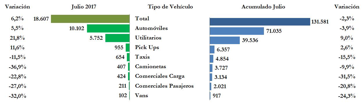 El acumulado general del 2017 hasta julio en lo que respecta a matrículas de vehículos nuevos por ciudad registra que fue de 131.581 unidades, el cual tuvo una caída de 2,3% respecto al 2016, donde los vehículos utilitarios presentaron el mejor desempeño hasta ahora, con un crecimiento de 9,0% frente al año anterior.