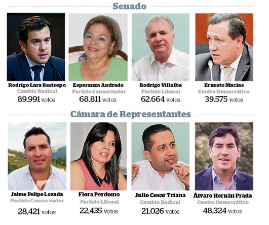 En lo que respecta a la Cámara de Representantes, la sorpresa la dio Cambio Radical que obtiene curul con Julio Cesar Triana; el Partido de la U, perdió la representación al ser superado por el Centro Democrático. Candidatos de las colectividades conservadora y liberal, revalidaron su curul.