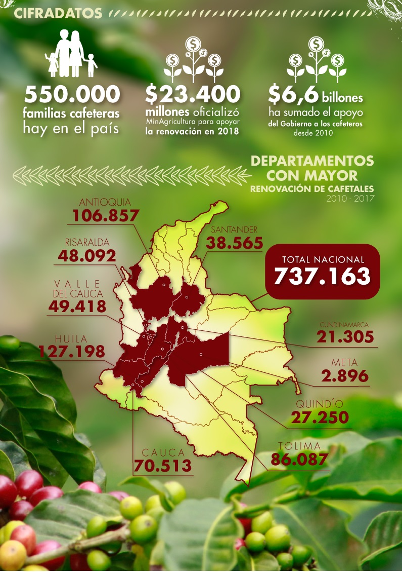 Además, el jefe de la cartera agropecuaria afirmó que "con estos recursos se renovarían cerca de 253 millones de árboles, equivalentes a 50.000 hectáreas cafeteras de las 90.000 que se tienen previstas para renovación en 2018. El Ministerio de Agricultura y Desarrollo Rural destinó $23.400 millones para desarrollar este trabajo, de los $39.000 millones".