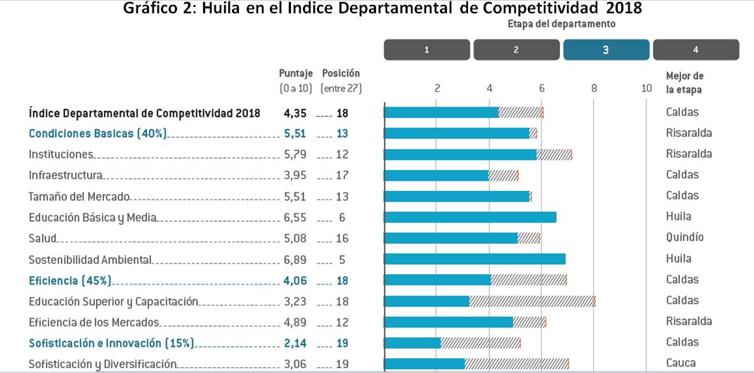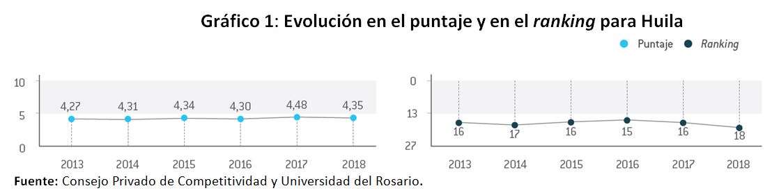 Las cifras así lo confirman. El departamento de Huila se ubica en la decimoctava posición entre 27 regiones del Índice Departamental de Competitividad 2018, calculado por el Consejo Privado de Competitividad (CPC) y la Universidad del Rosario y obtuvo una calificación de 4,35 sobre 10, con una disminución de 0,13 puntos respecto al puntaje obtenido en 2017 y una caída de dos lugares en la clasificación general.