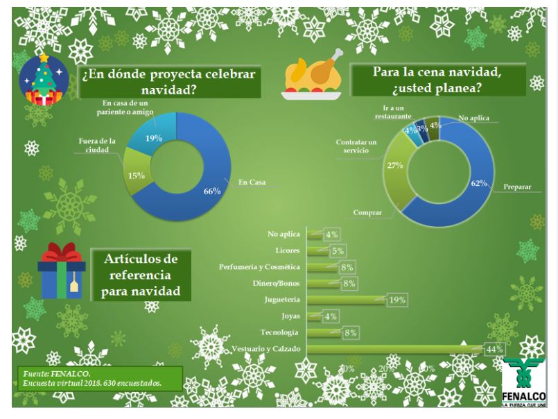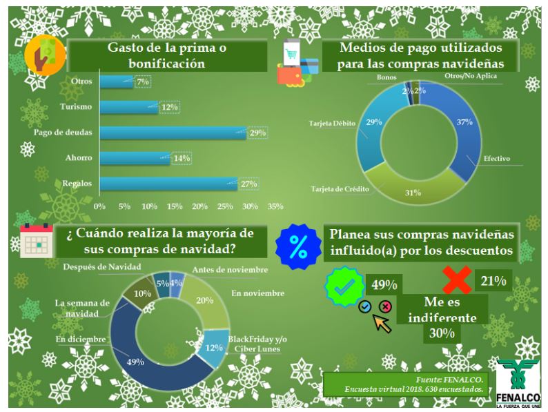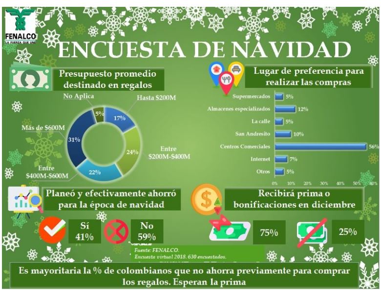 Según los resultados del estudio de Fenalco, el 59% de los colombianos afirmó que no planea ni ahorra para la época de Navidad. En consecuencia, muchos esperan la prima para poder comprar los regalos. Lo que sí planean son sus compras navideñas con base en los descuentos del comercio.