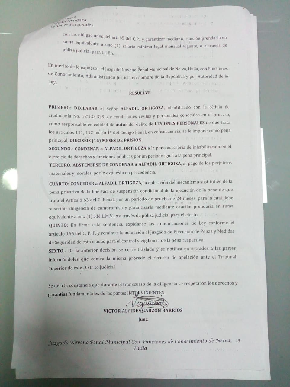 Luego de varios años de proceso judicial, se emite fallo condenatorio contra el diputado Alfadil Ortigoza. No obstante, El fallo establece que contra la decisión judicial procede el recurso de apelación ante el Tribunal Superior del Distrito de Neiva.