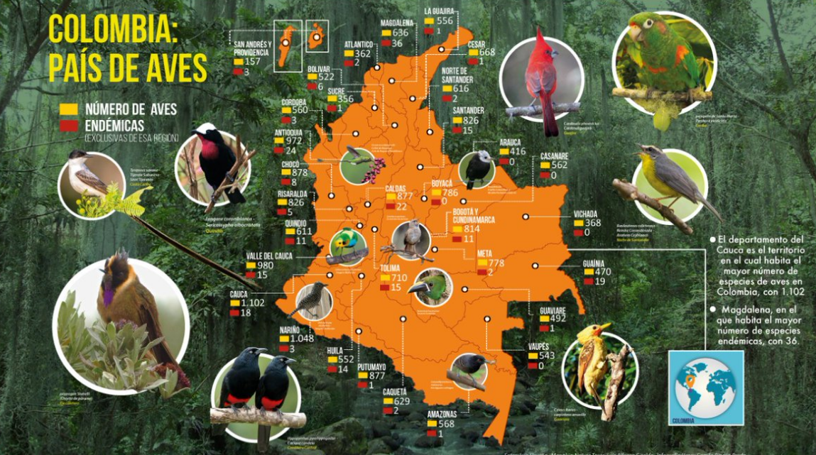 Colombia tiene 1.921 especies de aves –que representan el 20% de las existentes en el planeta–, de las cuales 79 son endémicas; es decir, solo se encuentran naturalmente en el territorio colombiano; 193, casi endémicas y 139, consideradas amenazadas o en riesgo de extinción.