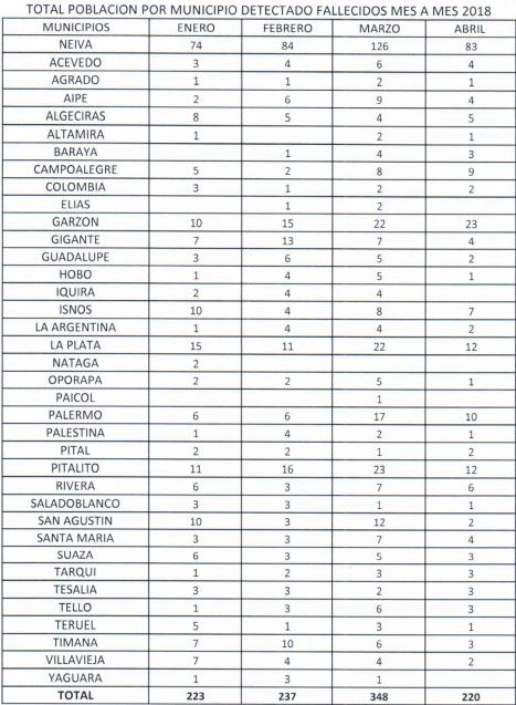 De acuerdo a las estadísticas emitidas por la Secretaría de Salud, registraron en enero 223 casos, febrero 237; marzo 348 y abril 220 casos. La capital opita presentó el mayor número de casos, en enero fueron 74, febrero 84, marzo 126 y abril 83. Le siguió Garzón que en enero notificó 10; febrero 15, marzo 22 y abril 23.
