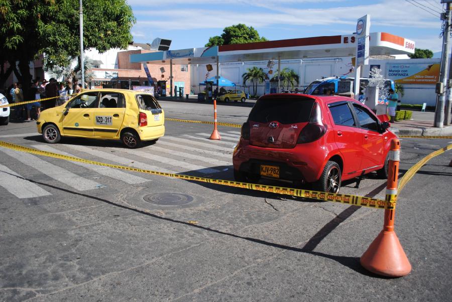 Un taxi y un vehículo particular fueron partícipes de un aparatoso accidente de tránsito, registrado hacia las 2:30 de la tarde de ayer en la esquina de la calle 4 con carrera 5, diagonal a la estación de servicio Milenium Gas en el centro de la capital huilense.