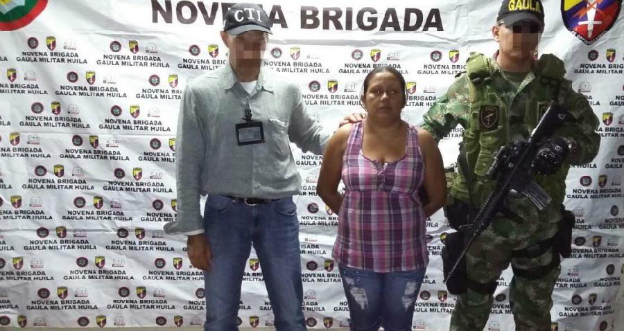 Tropas del Gaula Militar Huila, orgánicas de la Novena Brigada en coordinación con el Cuerpo Técnico de Investigación, CTI, capturaron a Claudia Milena Narváez Manjarrezm quien era requerida por tráfico de estupefacientes.