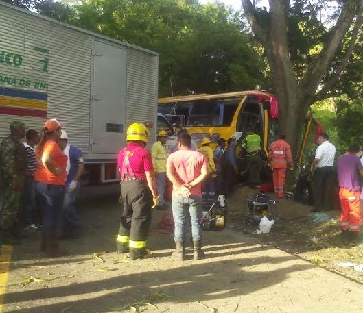 Un muerto y trece personas heridas es el saldo del accidente. Versiones preliminares indican que el accidente ocurrió porque el bus se salió de la carretera y se estrelló contra un árbol.