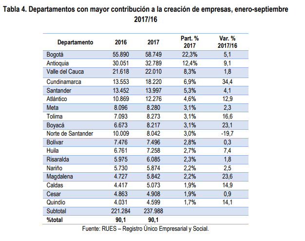 Según el informe entre los meses de enero y septiembre de 2017 se crearon 264.020 unidades productivas: 55.964 sociedades y 208.056 personas naturales, lo que representa un crecimiento de 7,6% con respecto al mismo periodo del año anterior.
