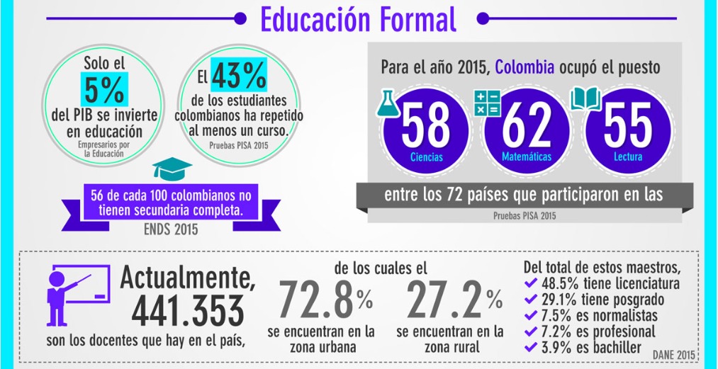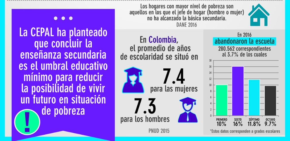 La Comisión Económica para América Latina y El Caribe, ha planteado que concluir la enseñanza secundaria es el umbral educativo mínimo para reducir la posibilidad de vivir un futuro en situación de pobreza, sin embargo, el promedio de años de escolaridad en Colombia se situó en 2015 en 7.3. Lo que significa que 56 de cada 100 colombianos cuentan con una secundaria completa.