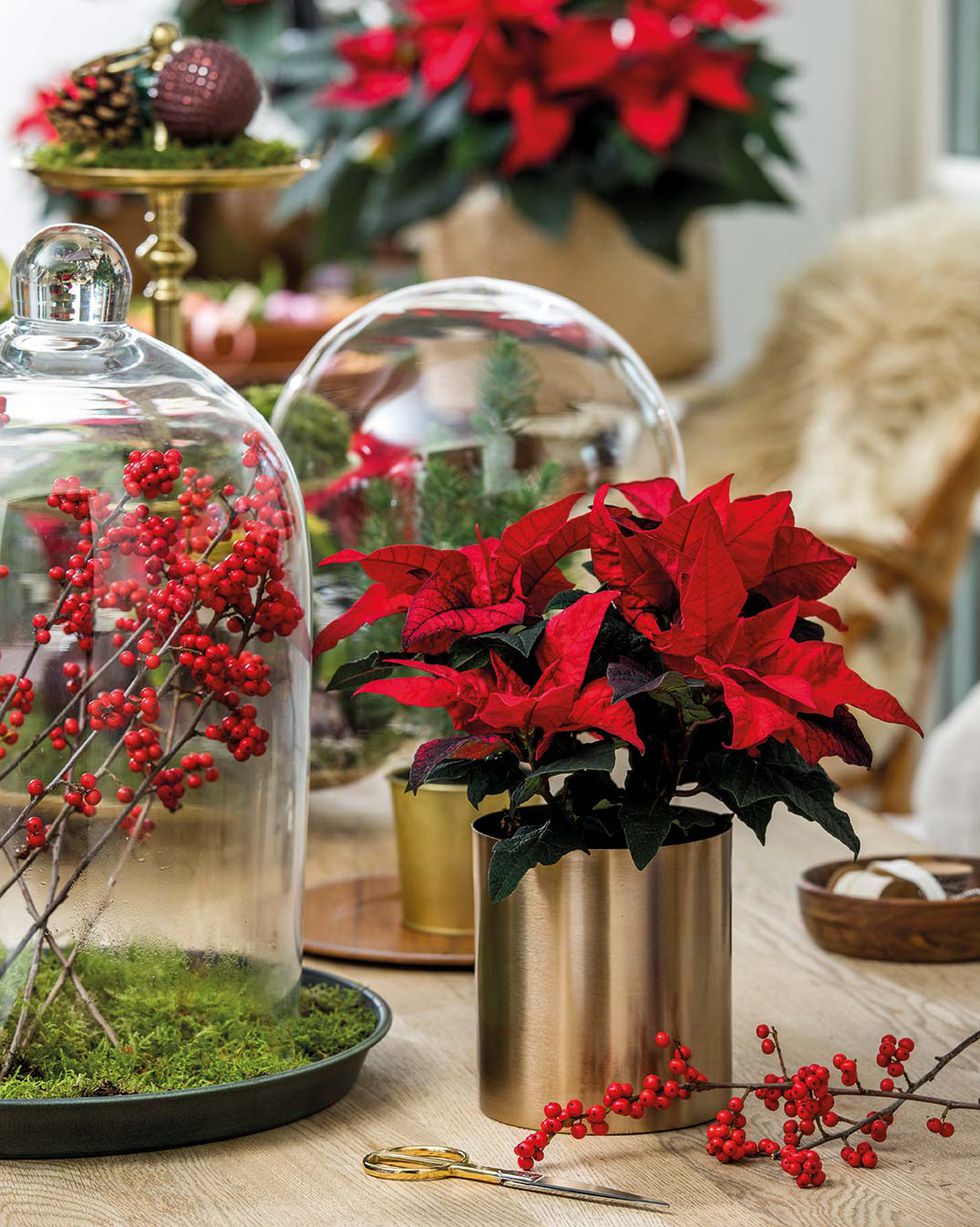 Idea decorativa para la Navidad. En esta propuesta de Stars of Europe, las brácteas se realzan con un cubremacetas dorado. A destacar, la poinsettia se combina con ramas de bayas rojas en campanas de cristal, un detalle que añade un plus de sofisticación.