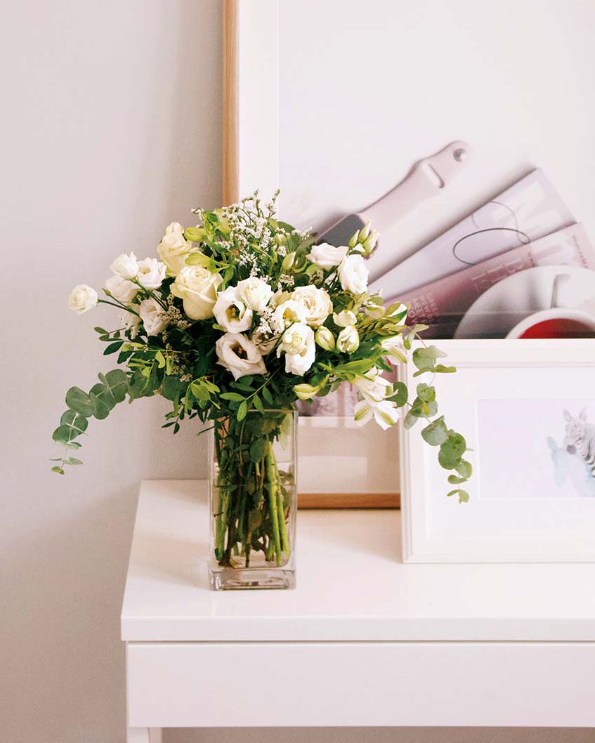 ¿Le gusta la nieve? ¿y las navidades blancas? Pues ahora puede evocar su belleza combinando lisianthus, rosas, astromelias y eucalipto para llenar cualquier ambiente con su luz, elegancia y aroma alpino.