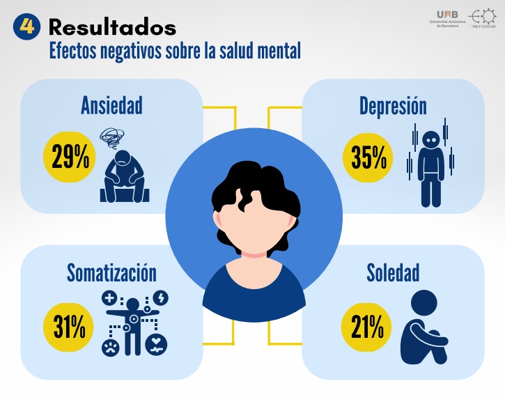 Así mismo el estudio realizado en Colombia demostró que los efectos en la salud mental han sido negativos ya que se presenta un 29% de ansiedad, 35% depresión, 31% somatización y 21% soledad.