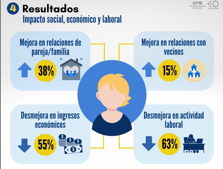 El impacto social, económico y laboral impactó en un 15% en mejora en relación con los vecinos y un 38% en relaciones de pareja y familia; mientras se presentó desmejora en ingresos económicos en un 55% y actividad laboral en 63%. En el estilo de vida se mejoró el tiempo libre en un 55% y 35% en alimentación, mientras se desmejoró la actividad física en un 50% y hábitos de sueño en 49%.