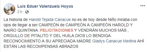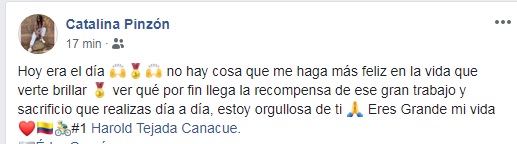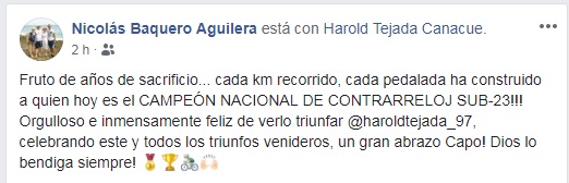 “Fue una crono bastante dura, larga, di todo de mí, me preparé muy bien. Estoy feliz por empezar el año con pie derecho. Quiero agradecerle a Dios, a mi familia, al Team Medellín, creo que me hacía falta el cambio, esto se lo dedico a todos mis compañeros, a Óscar Sevilla que es una gran motivación para mí y otros; seguimos preparándonos, este es el inicio de la temporada 2019, en la mañana me levanté con las ganas de ganar, motivado y ya esperamos que culminemos con broche de oro” expresó el pedalista huilense finalizada la prueba.