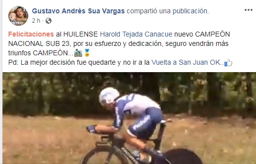 El huilense Harold Tejada Canacué sigue conquistando la historia del ciclismo y ahora se coronó campeón de la contrarreloj individual en el Nacional de Ruta realizado en el Meta; Tejada dominó en la prueba individual sub23 y se subió al podio.
