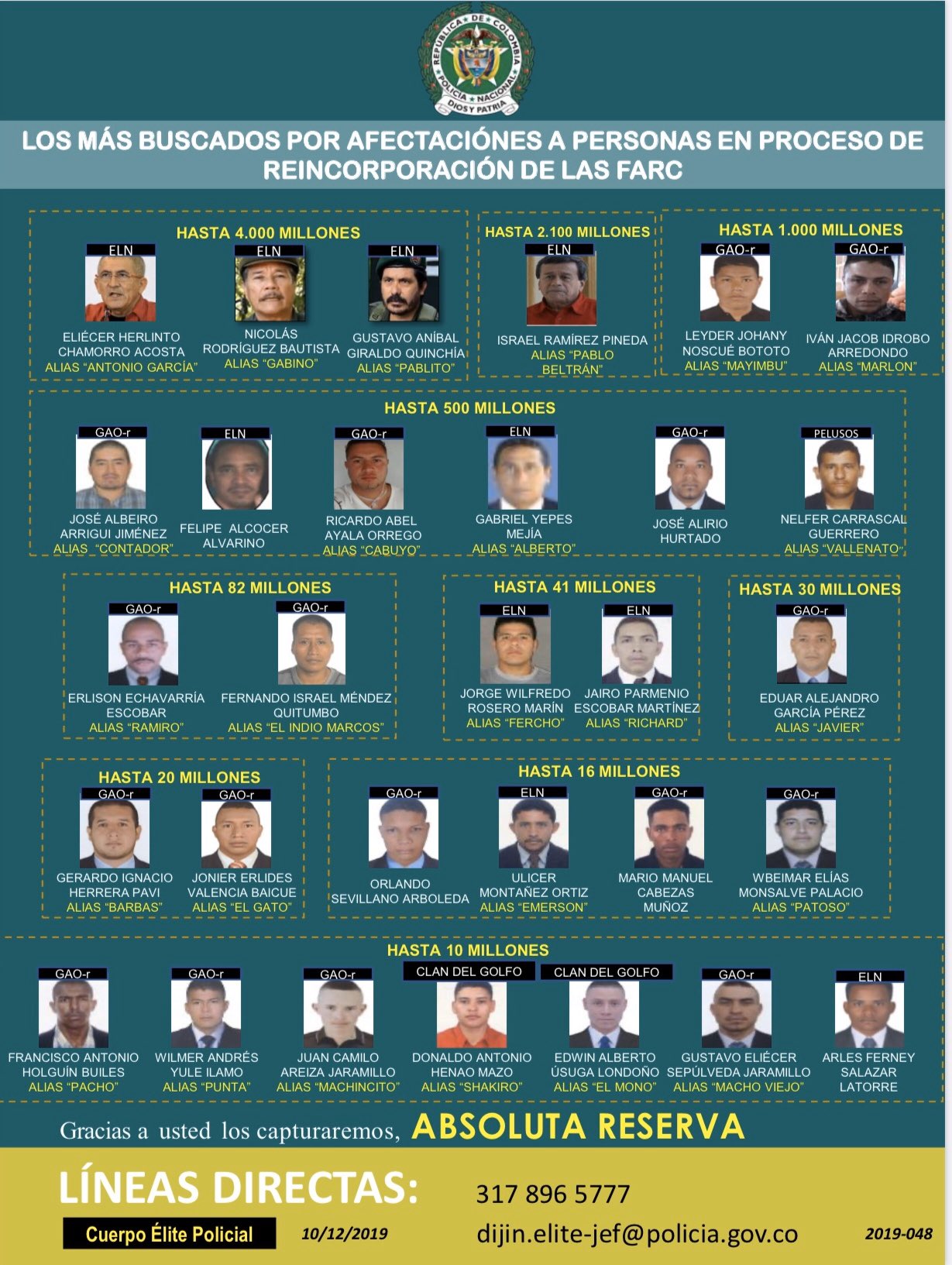 El monto que ofrece por alias ‘Gabino’, alias ‘Pablito’ y alias ‘Antonio García’, permanece igual desde febrero de 2019 y corresponde a 4.000 millones de pesos. Sin embargo, por alias ‘Pablo Beltrán’ ofrece 2.100 millones.