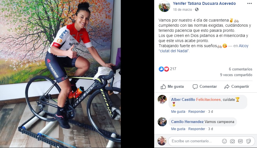 Diario del Huila intentó comunicación con las pedalistas quienes saludaron, pero no lograron responder a los interrogantes. Otra de las deportistas huilense es Yenifer Ducuara neivana integrante del VIB-Natural Greatness quien buscaba regresar al país antes del cierre de fronteras; el pasado 18 de marzo en sus redes sociales publicó: “vamos por nuestro 4 día de cuarentena, cumpliendo con las normas exigidas, cuidándonos y teniendo paciencia que esto pasara pronto. Los que creen en Dios pidamos a él misericordia y que este virus acabe pronto. Trabajando fuerte en mis sueños”.