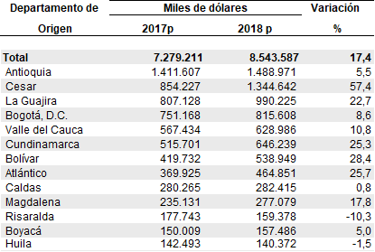 De acuerdo con las declaraciones de exportación presentadas ante la DIAN en lo corrido del año hasta abril de 2018, las ventas de productos señaladas con origen en el departamento de Antioquia representaron el 17,4% de las exportaciones totales sin petróleo y sus derivados; seguido de Cesar (15,7%), La Guajira (11,6%), Bogotá D.C. (9,5%), Cundinamarca (7,6%), Valle del Cauca (7,4%) y Bolívar (6,3%).