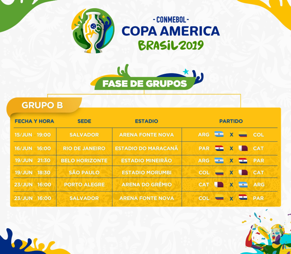 Argentina integrará el grupo B junto con Colombia, Paraguay y Qatar. Debutará el 15 de junio con los cafeteros, luego irá el 19 contra los paraguayos y el 23 ante la selección restante.