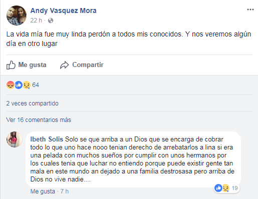 Tan pronto Anderson Vásquez Mora, comienza a escribir vía red social pidiéndoles a sus amigos, perdón por lo que hizo, las reacciones sin duda alguna fueron fuertes, algunos con rabia, pero otros asombrados porque aún no creían el error que había cometido, convertirse en un criminal.
