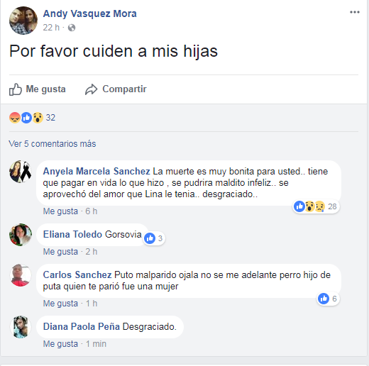 “La muerte es muy bonita para usted, se pudrirá en la cárcel. Que decepción, uno definitivamente no conoce a nadie...Que pague por lo que hizo. De Anderson Vásquez no lo puedo creer ... Gente tan falsa en esta vida. Pero bueno cada quien debe afrontar sus errores” así reaccionaron allegados de la joven Lina Carabalí Covaleda.