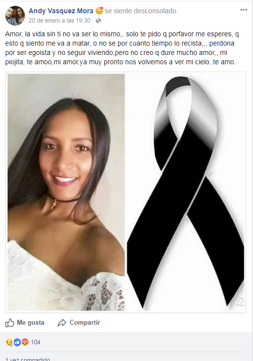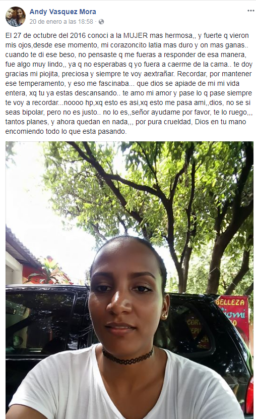 Anderson Vásquez, el verdugo de su propia compañera sentimental, invadido por la impotencia y el dolor sigue escribiendo mensajes de amor recordando a su amada como adolescente enamorado “Cuando te di ese beso, no pensaste que me fueras a responder de esa manera, fue algo muy lindo ya que no esperabas que yo fuera a caerme de la cama. Te doy gracias mi piojita, preciosa y siempre te voy a extrañar” expresa en la red social.