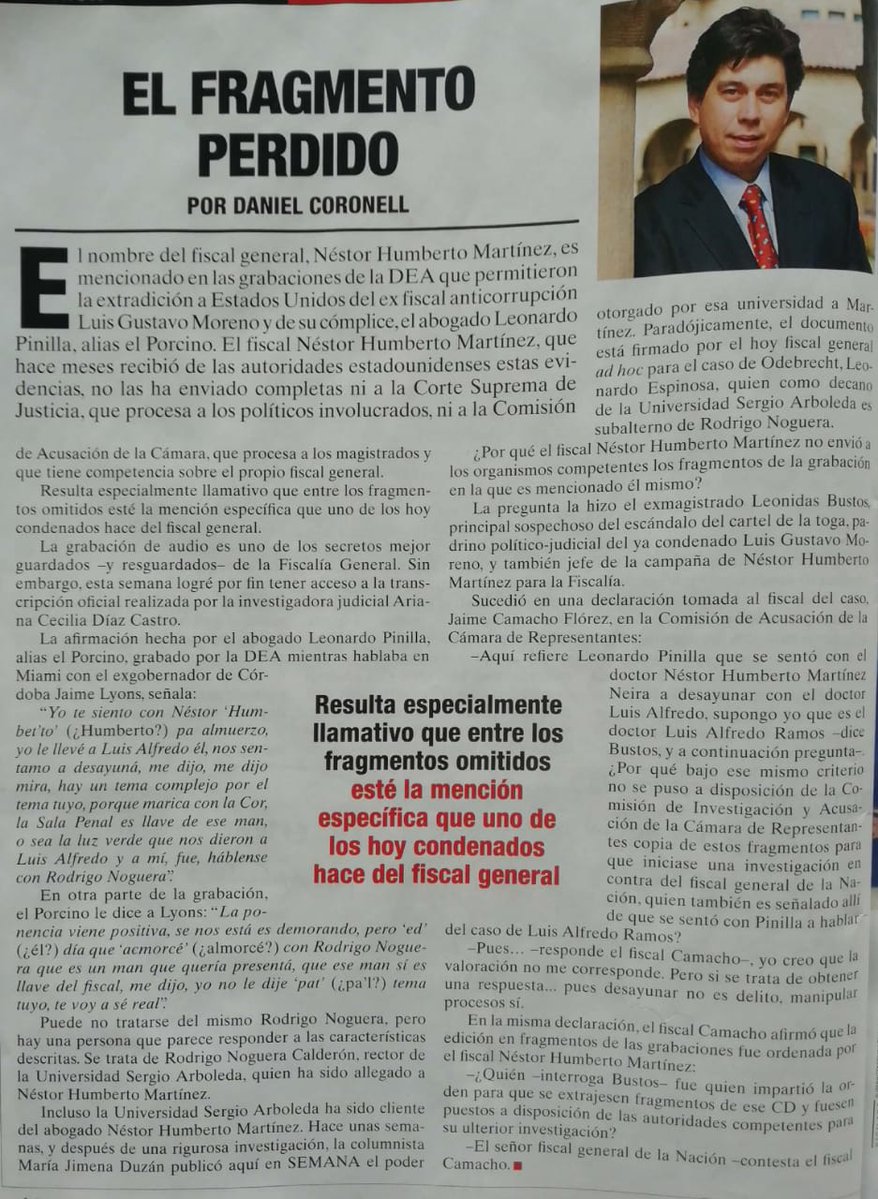 Finalmente, y para rematar el mal momento del Fiscal General, el domingo, en una columna publicada en la revista Semana, Daniel Coronell aseguró que en las grabaciones de la Administración para el Control de Drogas de EE UU (DEA) enviadas por la Fiscalía a la Corte Suprema y a la Comisión de Investigación y Acusación por el caso del ´Cartel de la toga´ no está el fragmento de una conversación entre el abogado Leonardo Pinilla y el exgobernador Alejandro Lyons en el cual se menciona al Néstor Humberto Martínez.