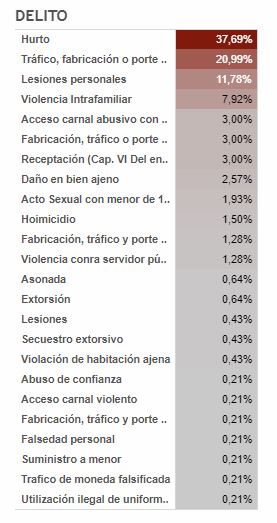Llama la atención que los delitos más cometidos en dicho periodo por los jóvenes en Neiva, son en su orden el hurto con un 37, 69% seguido por el tráfico o porte de armas con un 20,99% las lesiones personales se ubican en el tercer puesto con un 11,78%.
