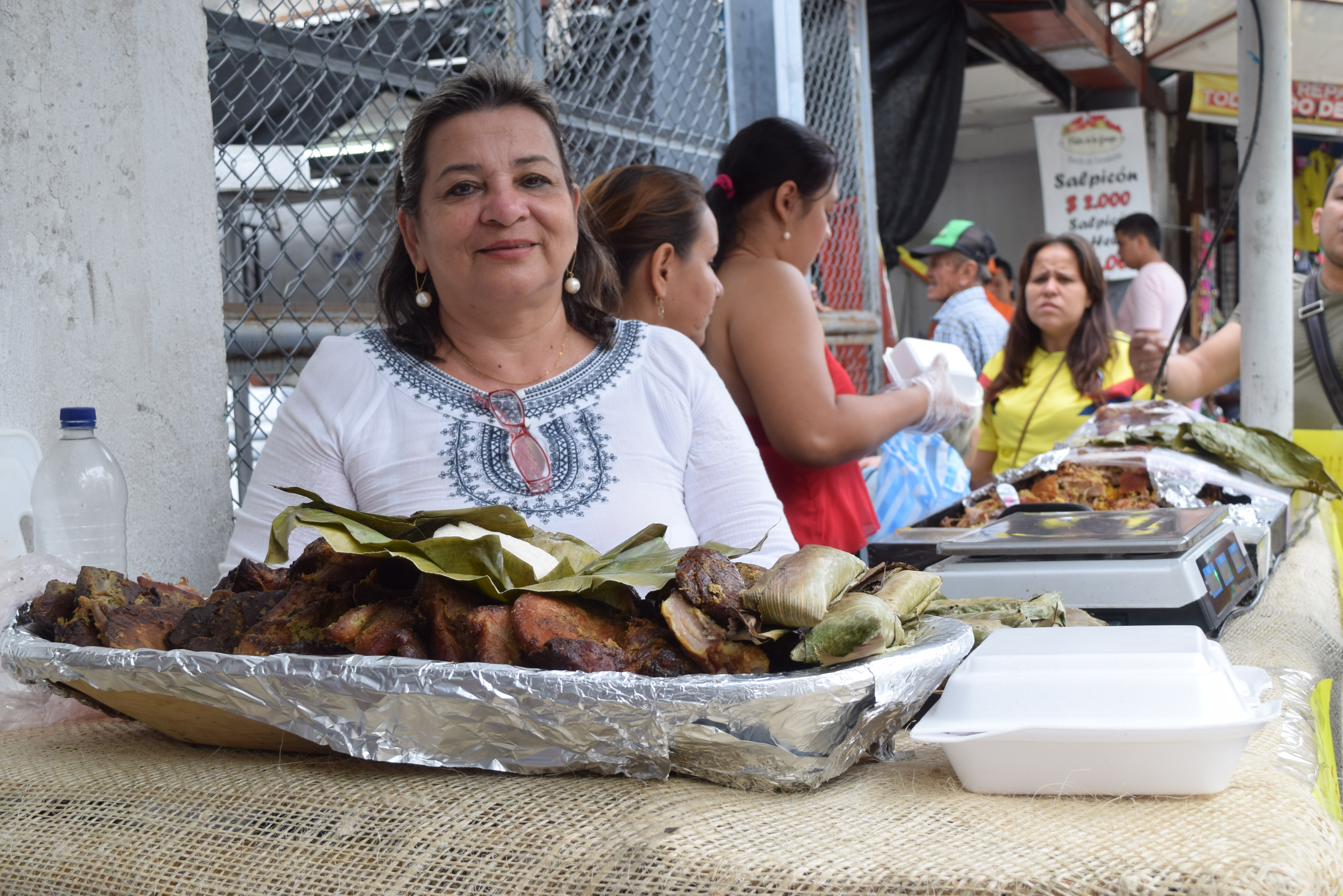 Alba Inés Pérez prepara el tradicional asado y lechona huilense. Desde 15 años vende estos exquisitos platos, antes en las instalaciones del extinto almacén Jep, hoy en la calle octava del microcentro de Neiva. La huilense dice que las ventas no han cambiado pues estas degustaciones tienen tradición.