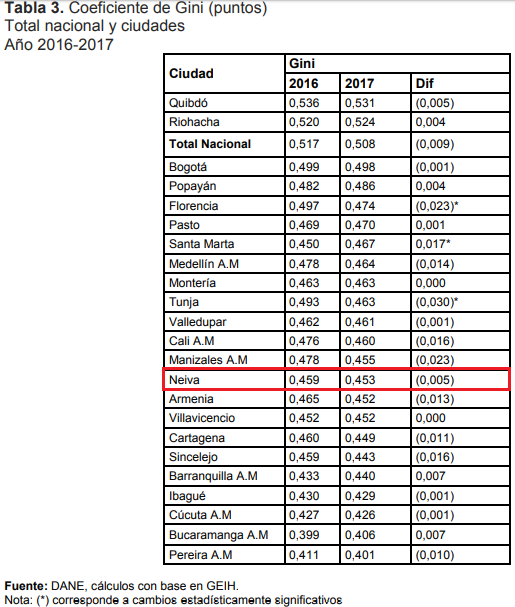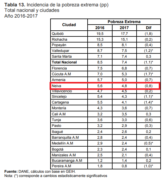 En pobreza monetaria, es decir, aquella que se mide con base en los ingresos de las personas, el indicador en la ciudad de Neiva bajó 1,1%, en pobreza extrema el guarismo presentó una disminución de 0,8% y en el coeficiente de Gini (desigualdad) la calificación cayó de 0,459 en 2016 a 0,453 el año pasado.