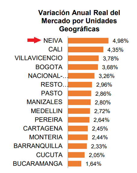 Las ciudades de Neiva, Cali, Villavicencio y Bogotá fueron las que presentaron un crecimiento superior al nacional, cada una respectivamente creció, 4,98%, 4.35%, 3.78% y 3.68%. En contraparte, las ciudades de Barranquilla (2.33%), Cúcuta (2.05%) Bucaramanga (1.64%) fueron las que menor crecimiento presentaron.