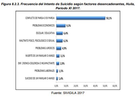 De igual forma, durante el periodo XI de 2017, en el departamento del Huilla el mecanismo más empleado para perpetrar el intento fue la intoxicación con 602 casos, seguido de las lesiones por uso de arma corto punzante con 197 casos. Además los principales factores desencadenantes de la conducta fueron los conflictos de pareja o expareja con 437 y los problemas económicos con 81 casos.