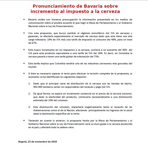 De esta forma y a través de un sendo comunicado la principal cervecera del país, Bavaria, mostró su inquietud frente a las modificaciones y propuestas que están surgiendo entorno a la Ley de Financiamiento, en medio de las reuniones que han adelantado los congresistas y el ministro de Hacienda, Alberto Carrasquilla en las últimas horas.