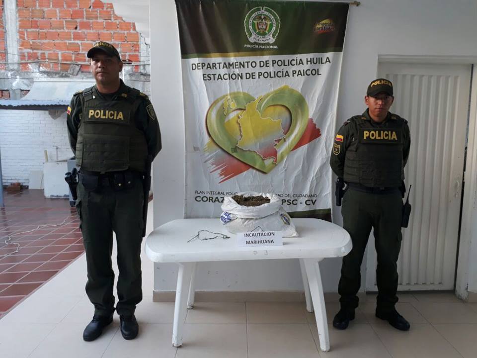 Asi mismo en el municipio de Paicol, la patrulla del cuadrante uno, en la labor de un puesto de observación, en un sitio conocido como el parador Alemania, por medio de información que ofreció un ciudadano indicando que metros más adelante, se encontraba un tula color blanco a la orilla de la carretera, las autoridades al verificar que contenía en su interior se halló una bolsa plástica de color negro, contando con una sustancia estupefaciente con características similares a la marihuana, con un peso de 3.124 gramos.