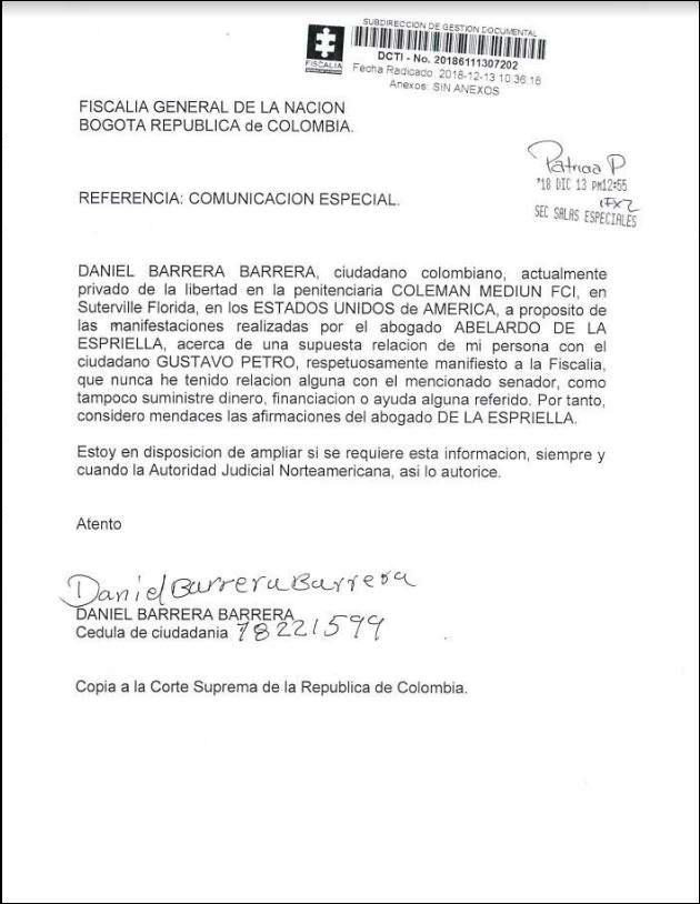 “Nunca he tenido relación alguna con el mencionado senador, como tampoco suministré dinero, financiación o ayuda alguna referido [Sic]”, dice Barrera.