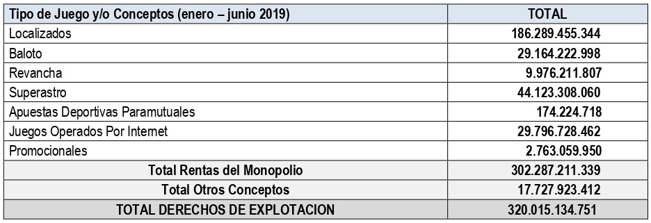En total, el recaudo por derechos de explotación ascendió a $320.015,1 millones. De ese dinero, los juegos localizados aportaron $186.289,4 millones; el Baloto, $29.164,2 millones; Revancha, $9976,2 millones; Superastro, $44.123,3 millones; apuestas deportivas paramutuales, $174,2 millones; juegos operados por internet, $29.796,7 millones; promocionales, $2763 millones; y otros conceptos, $17.727,9 millones.