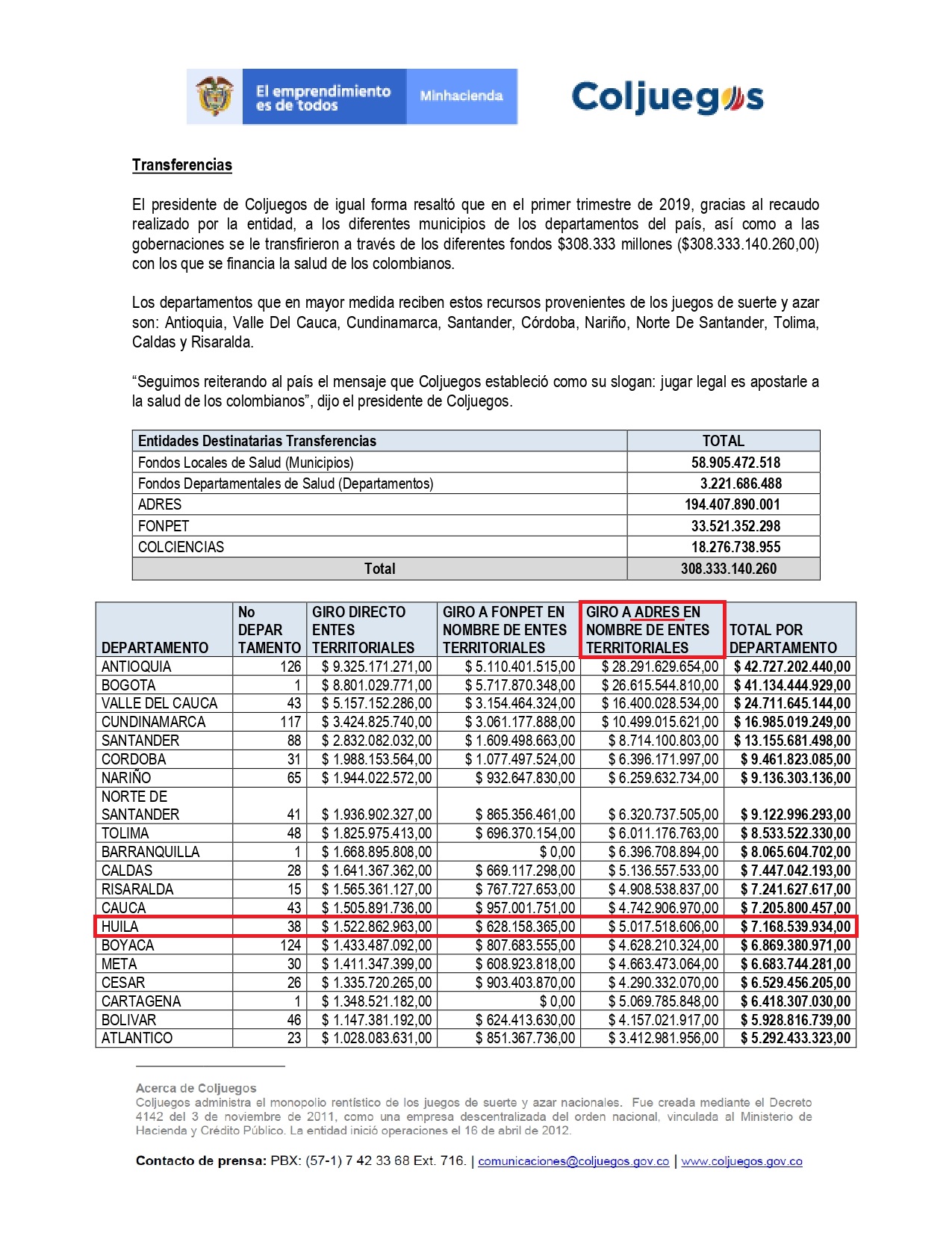 Sobre las transferencias realizadas a las regiones, el presidente de Coljuegos resaltó que en el primer trimestre de 2019, gracias al recaudo realizado por la entidad, a los diferentes municipios de los departamentos del país, así como a las gobernaciones se le transfirieron a través de los diferentes fondos $308.333 millones ($308.333’140.260,00) con los que se financia la salud de los colombianos. Esto incluye los giros directos ($78.981,6 millones), los dineros consignados a FONPET ($33.521,3 millones) y los que se envían a ADRES ($195.830,1 millones).