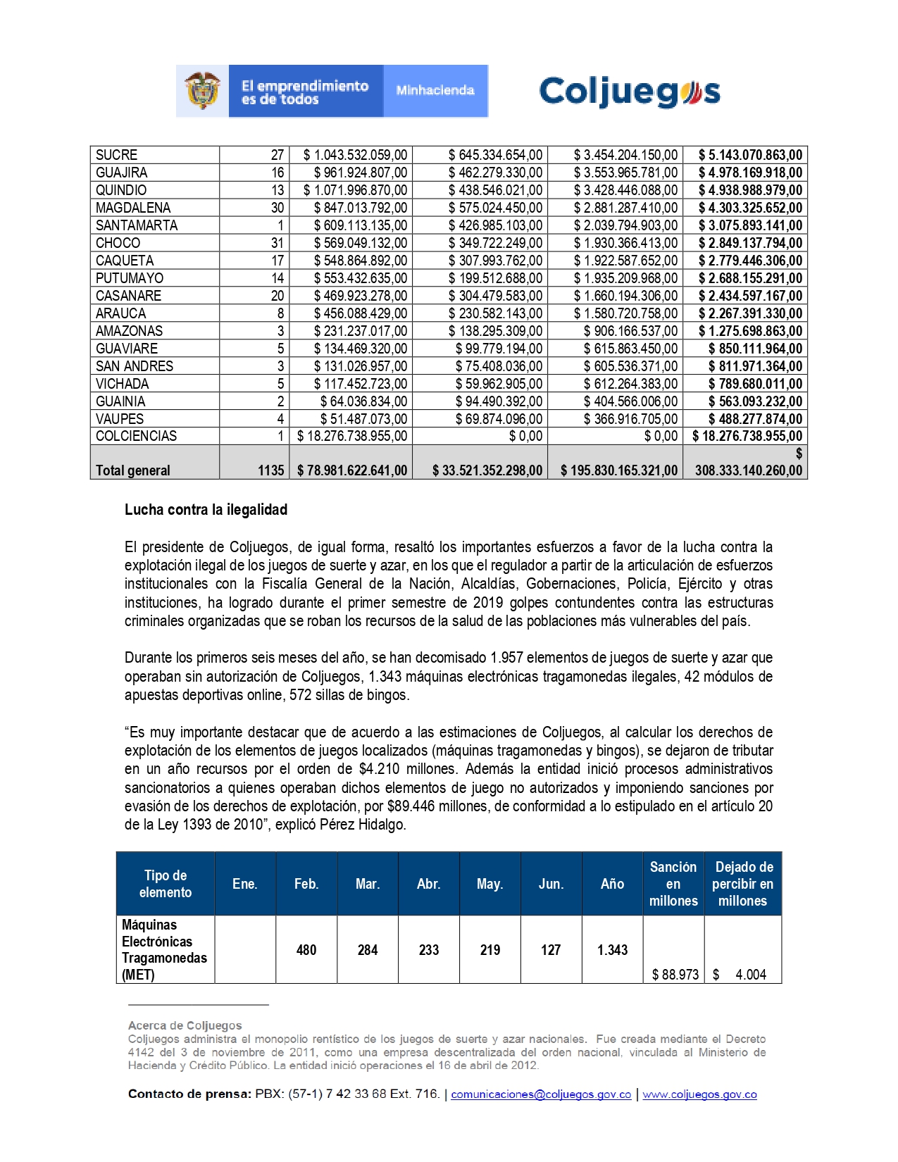De acuerdo con el presidente de Coljuegos, Juan Pérez Hidalgo, este recaudo por derechos de explotación del monopolio de los juegos de suerte y azar permite evidenciar un crecimiento comparado con el mismo periodo de 2018 del 13 %, al haber recaudado en el primer semestre de 2018 un total de $278.057’682.985.