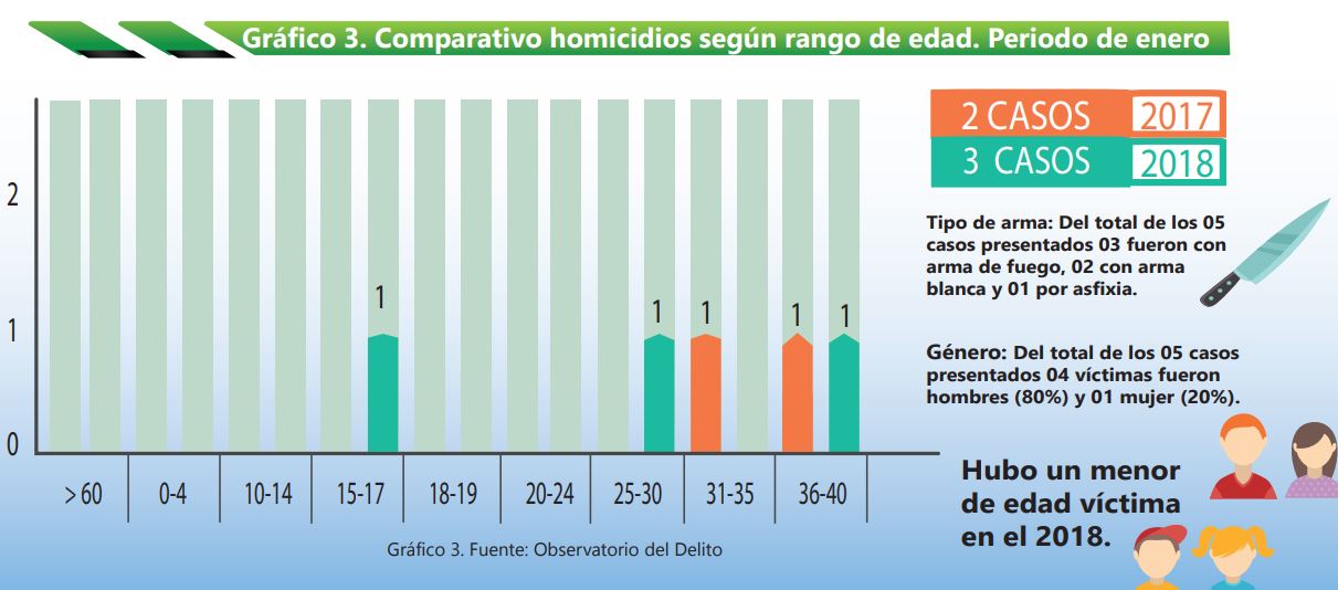 Además de los cinco casos presentados en los dos años en el mes de enero, tres fueron con arma de fuego, dos con arma blanca y uno por asfixia. Igualmente cuatro de las víctimas fueron hombres con el 80% y una mujer en el 20%. También hubo un menor de edad víctima en el 2018.