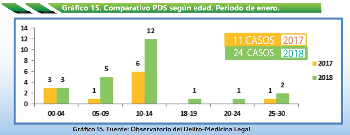 En el 2017 el 90,90% de las víctimas fueron menores de edad. Igualmente en el 2018, el 83,33% de las víctimas fueron menores de edad. De los 24 casos, doce fueron víctimas entre los 10 a 12 años, cinco entre 5 a 9 años; incluso los recién nacidos en edades de 0 a 4 años, fueron víctimas en 3 hechos y dos entre 25 a 30 años.