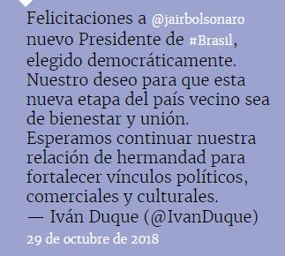 El gobierno colombiano, a través de un comunicado, reiteró su voluntad de seguir estrechando los lazos de cooperación con Brasil y deseó suerte a Jair Bolsonaro como mandatario de ese país.
