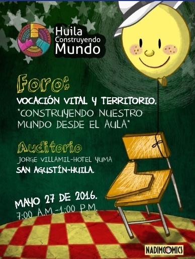 Para este 27 de mayo, el proyecto Huila Construyendo Mundo realizará en el recinto auditorio Jorge Villamil del Hotel Yuma en el municipio de San Agustín, el foro: Vocación vital y territorio “Construyendo mundo desde el aula”.