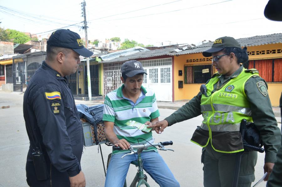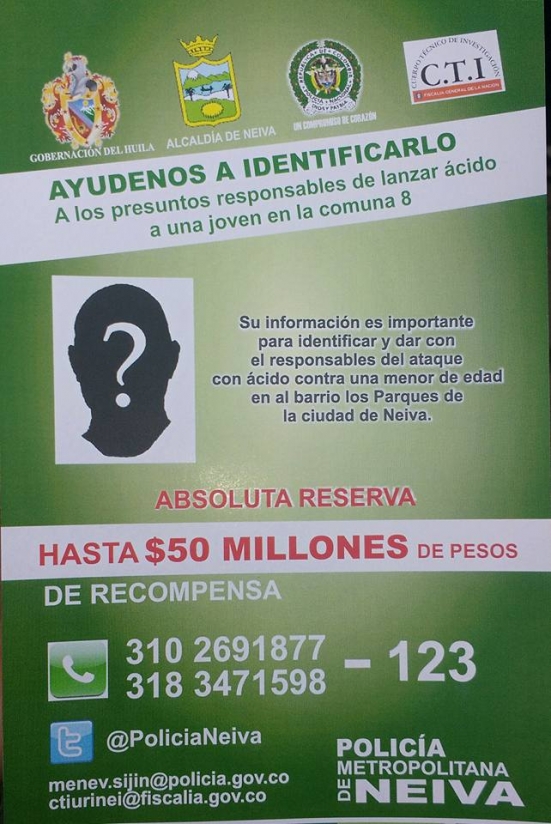 Buscando recolectar datos que den con el paradero del responsable de arrojar ácido en la cara a una menor de edad, la Policía Metropolitana de Neiva, hombres del Esmad, la Fiscalía y el CTI recorrieron la Comuna 8 de Neiva entregando volantes a la ciudadanía.