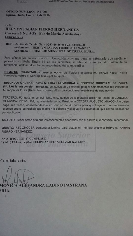 El Juzgado Único Promiscuo del municipio de Íquira ordenó como medida provisional al Concejo Municipal, la suspensión de manera inmediata del concurso de méritos para la elección de personero.