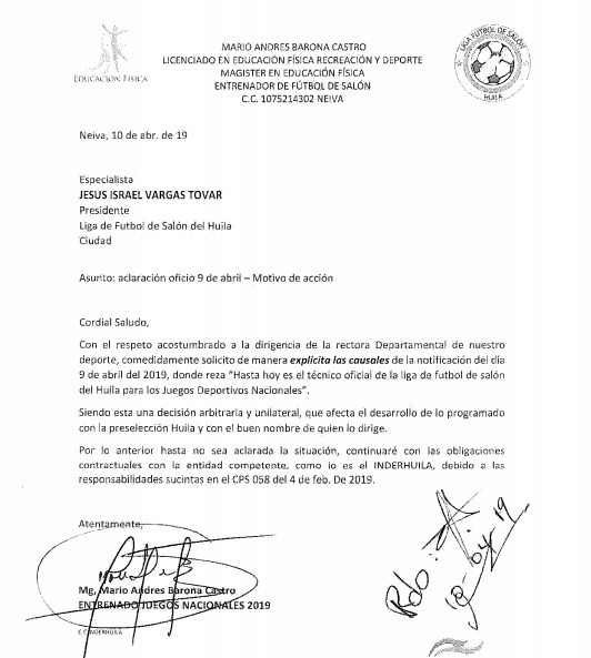 La notificación de la terminación de su vinculación con la selección la recibió el día 9 de abril de 2019 en donde se expresó: “hasta el día de hoy es el técnico oficial de la liga de fútbol de salón del Huila para los Juegos Deportivos Nacionales…”, “Me toma por sorpresa porque en enero se hizo una reunión con el presidente para llegar a acuerdos y poder darle continuidad al proceso de Juegos Nacionales puesto que se tiene objetivo claro con estos deportistas que es llegar a ser campeones en Arjona, Bolívar donde se desarrollará el campeonato. Más que apelar la decisión simplemente cuando llega la notificación recurro a entregar un oficio al presidente de la Liga de Fútbol de Salón solicitando las causales por las cuales se me hizo a un lado debido a que no entendía por qué de un día para otro se toma una decisión sin argumentos claros, puesto que estaba vinculado a un contrato de prestación de servicios con el Inder Huila para el desarrollo y la atención a los deportistas de fútbol de salón de dicha selección y ciertamente ese oficio nunca lo respondió por escrito, nunca me dio unas razones valederas” explicó con detalle Barona.