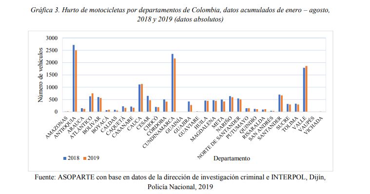 De acuerdo con Asopartes, a nivel nacional entre el 1 de enero al 31 de agosto de 2019, se aprecia una mayor disminución en el porcentaje total de hurtos, mientras que para la misma fecha del año anterior, acumulaba el 12.9% del total de hurtos a motocicletas, para este año ese porcentaje disminuyó a 9.2%. De esta manera el hurto total de vehículos y motocicletas en el mes de agosto dejó de representar el 13.0% de 2018 en el total de hurtos a representar el 9.4%.