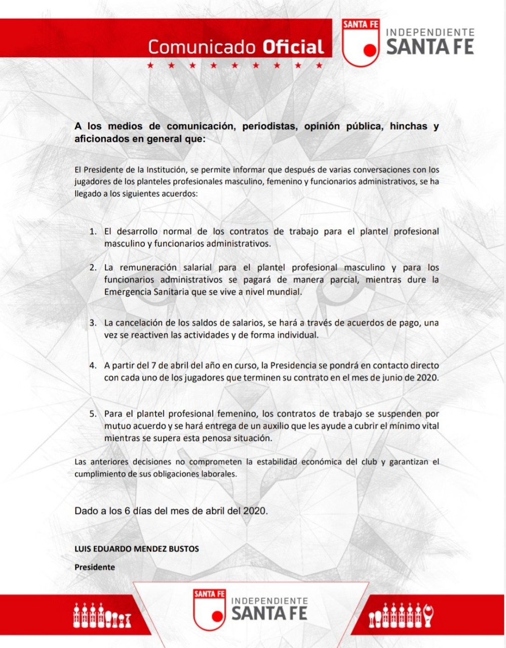 En el comunicado firmado ayer por Luis Eduardo Méndez Bustos presidente del Independiente Santa Fe se enunciaron cinco puntos en los que se destaca el normal desarrollo de los contratos de trabajo para el plantel profesional masculino y funcionarios administrativos.