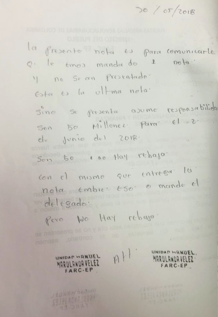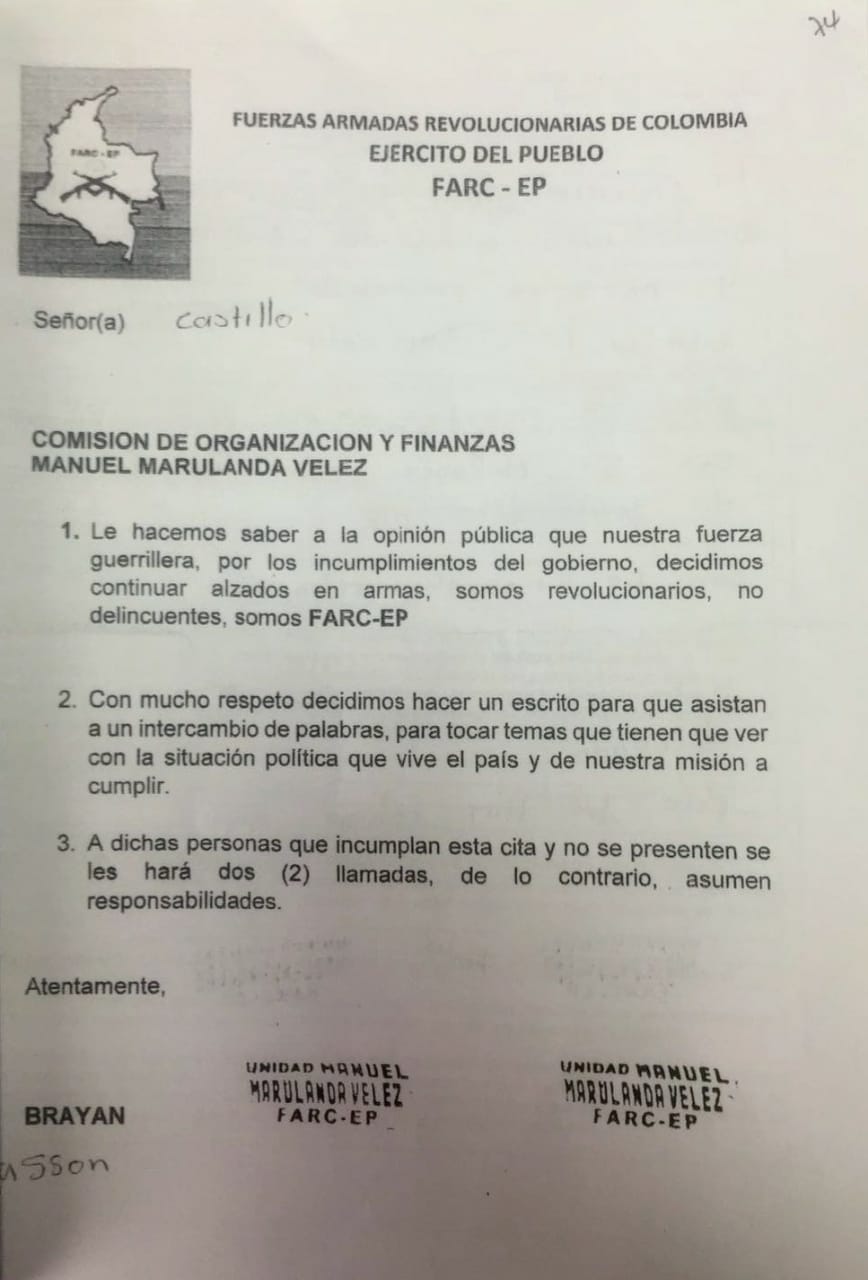 Su modus operandi presuntamente consiste en hacer llegar a sus casas o negocios, panfletos a nombre de la comisión de organización y finanzas del frente Manuel Marulanda de las Farc, en el cual señalan que no están de acuerdo con el Proceso de Paz, que se encargarán de hacer ‘limpieza’ y por tanto los convocan a una reunión en zona rural para hablar temas políticos, e indican que si no acuden a la cita después de dos llamados, deberán atenerse a las consecuencias.