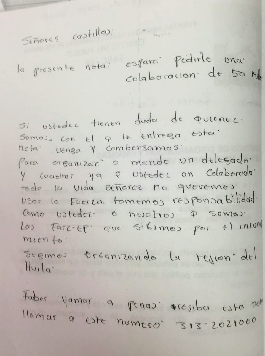 Según el representante de la Fiscalía delegado ante el Gaula que adelanta la investigación, los hechos tuvieron ocurrencia este año, cuando 8 comerciantes de otros municipios tales como Hobo, Campoalegre, Gigante, Garzón y Neiva, fueron constreñidas mediante la exigencia de las llamadas ‘vacunas’ a nombre de dicho grupo, infundiendo temor y zozobra.